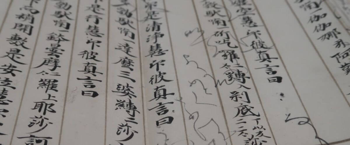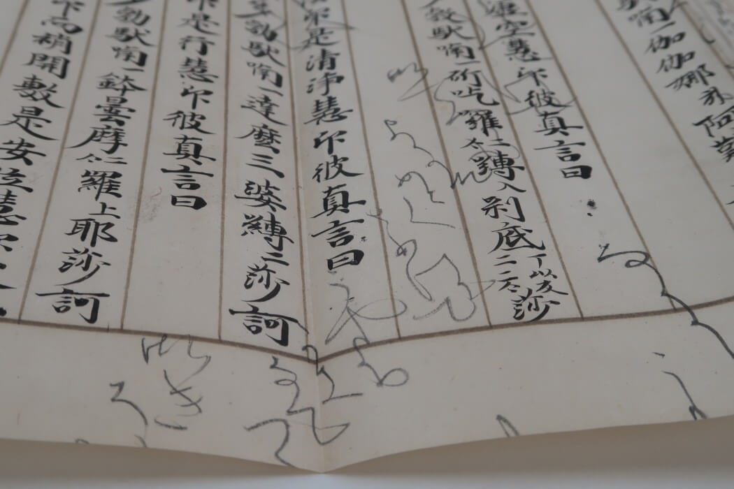 Dr Halle O’Neal’s fascinating lecture ‘Ephemeral Things: Paper, Memory, and Women Makers in Medieval Japan’, explored the role of letter sutras (shōsokukyō) in rituals of mourning after the death of a loved one. Letter writing was a central practice at the imperial courts of Kyoto and Kamakura, and following the death of a family member or loved one, letters were often preserved and transformed into memorial objects. Sutras were printed or written on the verso of the scroll—frequently embellished with gold, silver, or indigo—or written on the recto, obscuring the original contents of the letter. In other cases, letters were recycled entirely and reused for the copying or printing of sutras.
