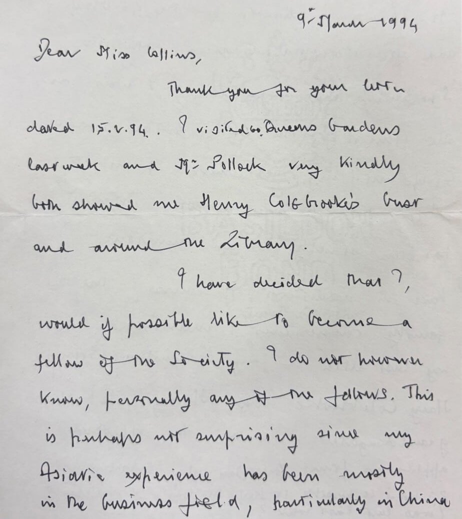 In our Archive, we hold a letter written by Kit documenting his first encounter with the Society: ‘I visited 60 Queen’s Gardens and Mr Pollock very kindly both showed me Henry Colebrooke’s bust and around the Library. I have decided that I would if possible like to become a fellow of the Society…’