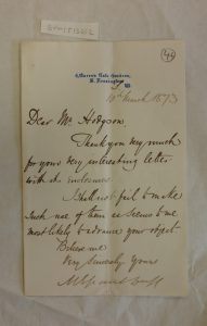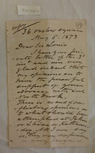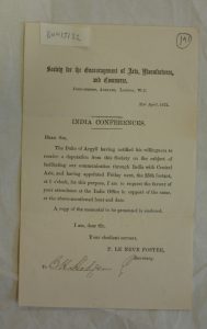In 1873, the Society for the Encouragement of Arts, Manufactures and Commerce decided that they would send a deputation to the Duke of Argyll (who Hodgson consistently misspells as the Duke of Argyle). George Campbell, the 8th Duke of Argyll, had been appointed as Secretary of State for India in Gladstone’s Government of 1868. Hodgson was keen to join the deputation and write a paper to present to the Duke. So in the archive there is a letter from P. Le Neve Foster, Secretary of Society for the Encouragement of Arts, Manufactures and Commerce to Brian Houghton Hodgson to inform him that the Duke of Argyll has notified his willingness to receive a deputation from the Society and to request Hodgson’s attendance at the India Office for this purpose.