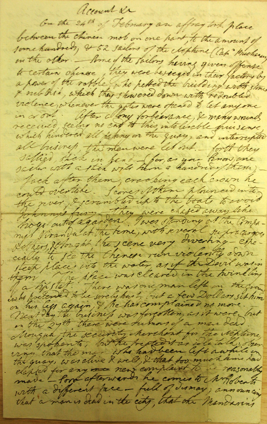 The Company agreed and Manning secured a berth aboard the Thames which sailed from Portsmouth in May 1806, reaching Canton in January 1807. Here he lived in the Company factory, set about learning the Chinese language, and undertook both medical and translation work. Manning included in his letters details of life and events in Canton. One such episode was the riot that led to the death of a Chinese man and precipitated the diplomatic incident over the crew of the East India boat, Neptune. Manning appears to have observed the events on the day and wrote an eyewitness account, as well as comments on the ensuing trial: “…The court is opened in a very striking manner – 1st Solemn & lofty words by a herald – then a lengthened resounding cry of hou… then a sonorous & aweful clangor of Gongs – But what is the examination that succeeded – in one word Nonsense! Each man asked to say that he is guilty or to accuse some of his companions. Each man refuses… To hear those ragamuffins speak they were all as gentle as Lambs that day… would not hurt a Chinaman for the world”.