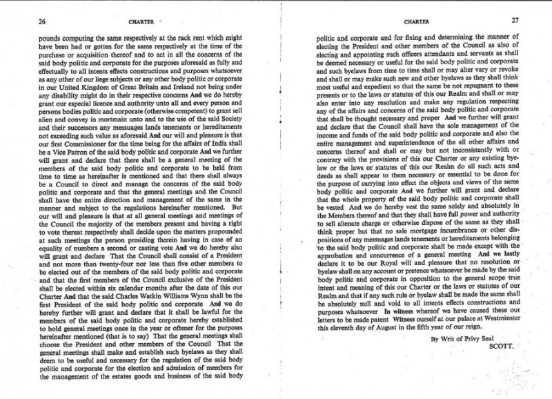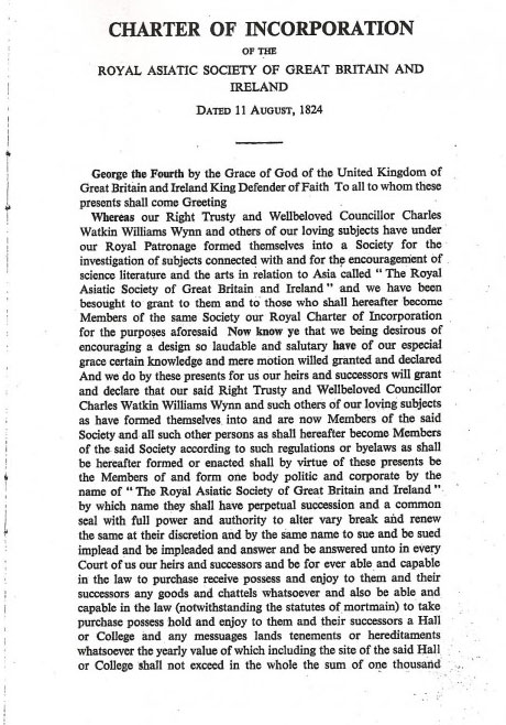 The Royal Asiatic Society received its Charter of Incorporation from King George IV on the 11th August 1824 for ‘the investigation of subjects, connected with, and for the encouragement of Science, Literature, and the Arts, in relation to Asia’. The full text of the Charter is available in the below images: