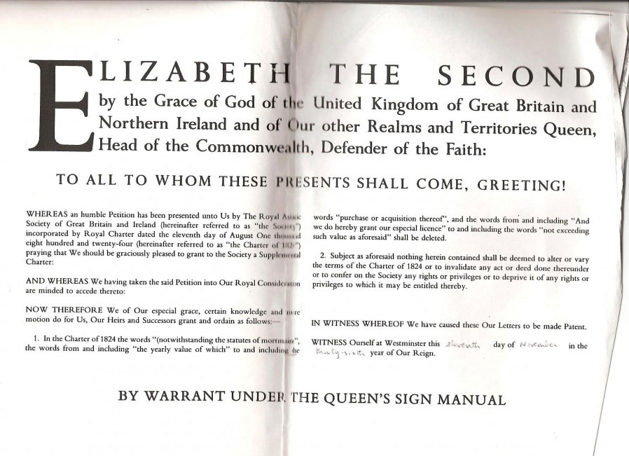At the Society’s request, a Supplemental Charter was granted to the Society on 11th November 1987 to modify the wordings of the 1824 Charter. The text of the Supplemental Charter is reproduced in the below image: