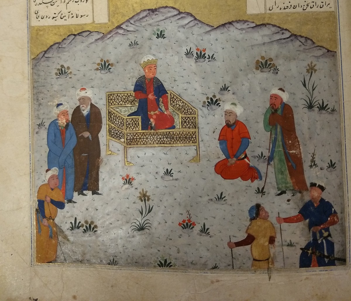 The Hayretu’l-Ebrar is a mathnawi in which Nava’i talks about social, political and moral issues, sharing his opinions while doing so. This section concerns justice, and Nava’i explains the ideal relationship between the rulers and their people, and the fact that the rulers are just and merciful is extremely important for the continuation of the state. At the end of the chapter, the khanate struggle of Gazi Shah is mentioned. Accordingly, when Gazi Shah came to the throne, justice came to the country, the persecution was over, and the ruins were restored. One day, an old lady cried and grabbed Gazi Shah’s jubbah and said that his soldiers had ruined a wheatear in her field. She did not want Shah to get angry with her at that moment: she wanted to bring this complaint to an Islamic court instead. Because Gazi Shah was a just man, he ordered his men to bring a kadi (judge) for the trial. At the end of the trial, the Shah says “I sacrifice my life for the prophet’s decree”. He blindfolds a hundred soldiers with a piece of cloth and gives a sword to the woman. On the other side, he scatters silver and treasures. He says to the woman, take the silver for your loss, but whichever you choose, I definitely accept. In the face of this justice and fairness, the old woman apologized to the Shah and withdrew her complaint. This picture depicts the trial of this old woman and Gazi Shah in the presence of the judge.