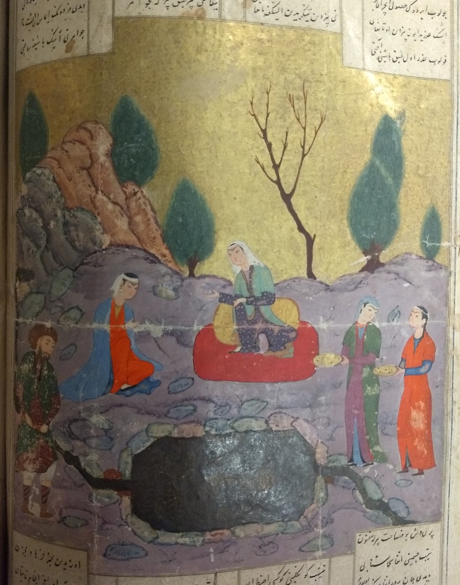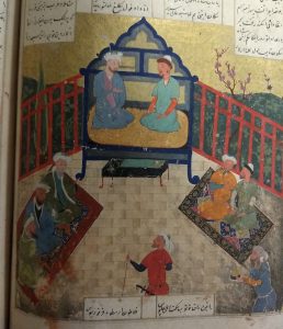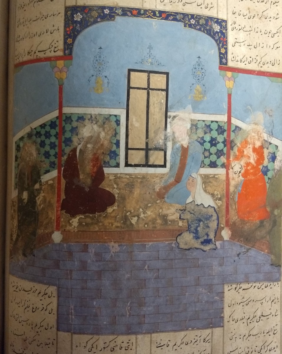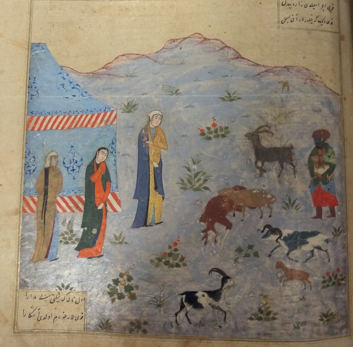 Dr Funda San (Yildiz Technical University) is currently exploring the Society’s collection of Turkish manuscripts, as part of a research project supported by TUBITAK (The Scientific and Technological Research Institution of Turkey). We recently asked Funda for some insights into RAS Turkish 47, which is one of the most frequently requested manuscripts in our Turkish collections. An early copy of the Kulliyat (collected poems) of Ali-Shir Nava’i (1441-1501 CE), this manuscript dates from the C16th and contains five miniature paintings. Funda kindly compiled some notes about the scenes depicted in these paintings to help inform and guide other library users seeking to enjoy this manuscript. We are delighted to make her notes available via our blog, with her permission.