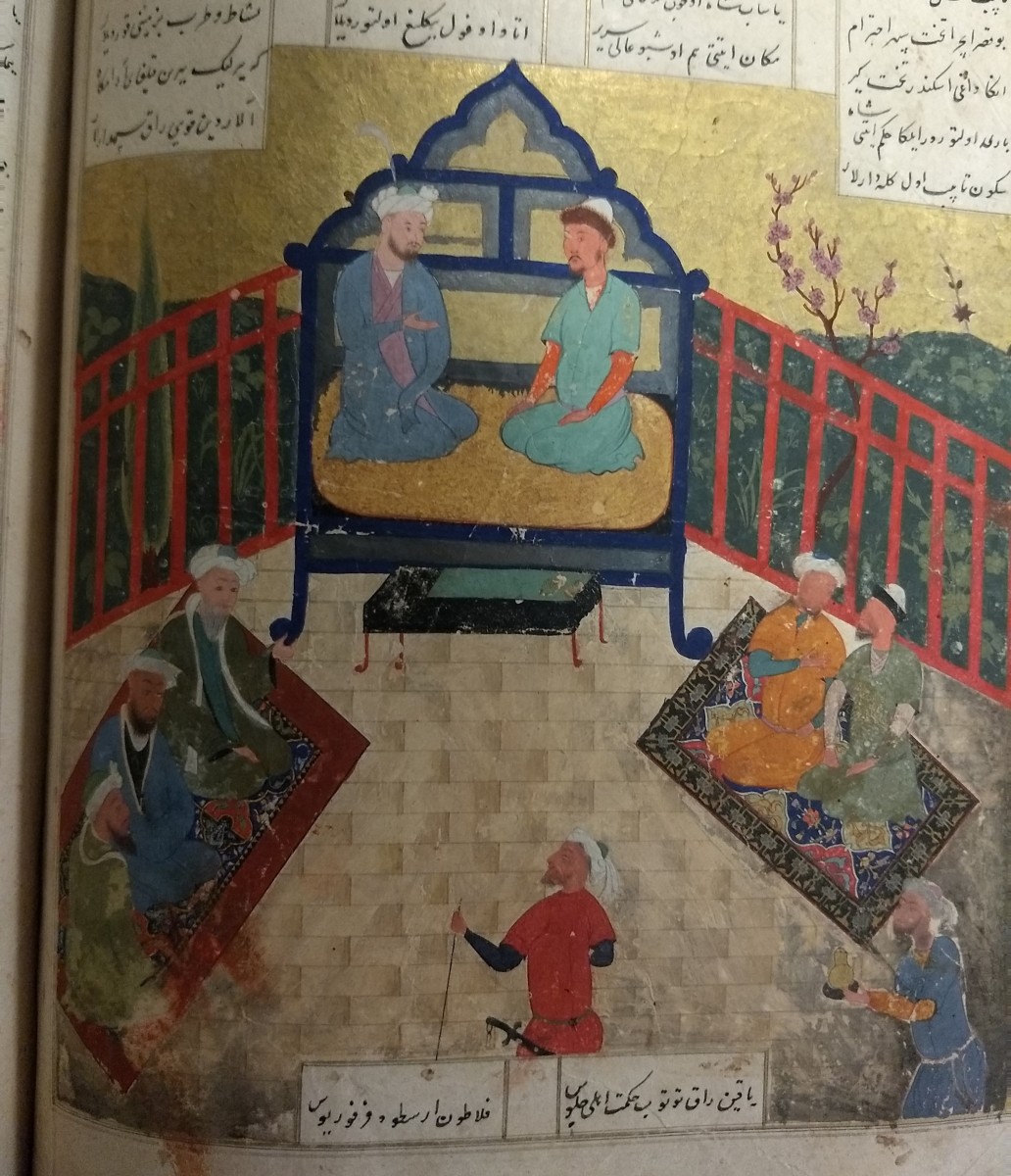 The Chinese khan gives a great feast for Alexander. The hospitable khan gives a place to Alexander to sit on the throne. The khan and Alexander sit side by side on the throne and chat, just like father and son. Plato, Aristotle, and Porphyry, the people of wisdom, also sit next to them. The Chinese khan offers all his treasures to his guests. He gives a wonderful concubine and a magical mirror to Alexander, along with many valuable gifts. The concubine is both beautiful and a very good fighter. The mirror is a talismanic mirror that shows both faces. Thanks to the mirror, it can be understood who is right and who is lying. Alexander is very pleased with the mirror and starts to think about his talisman all the time. He asks the people of wisdom about the mystery of the mirror. Alexander accepts the gifts and returns to his headquarters the next morning. In this picture, Alexander and the Chinese khan are on the throne, and philosophers such as Aristotle, Plato and Porphyry are also shown.