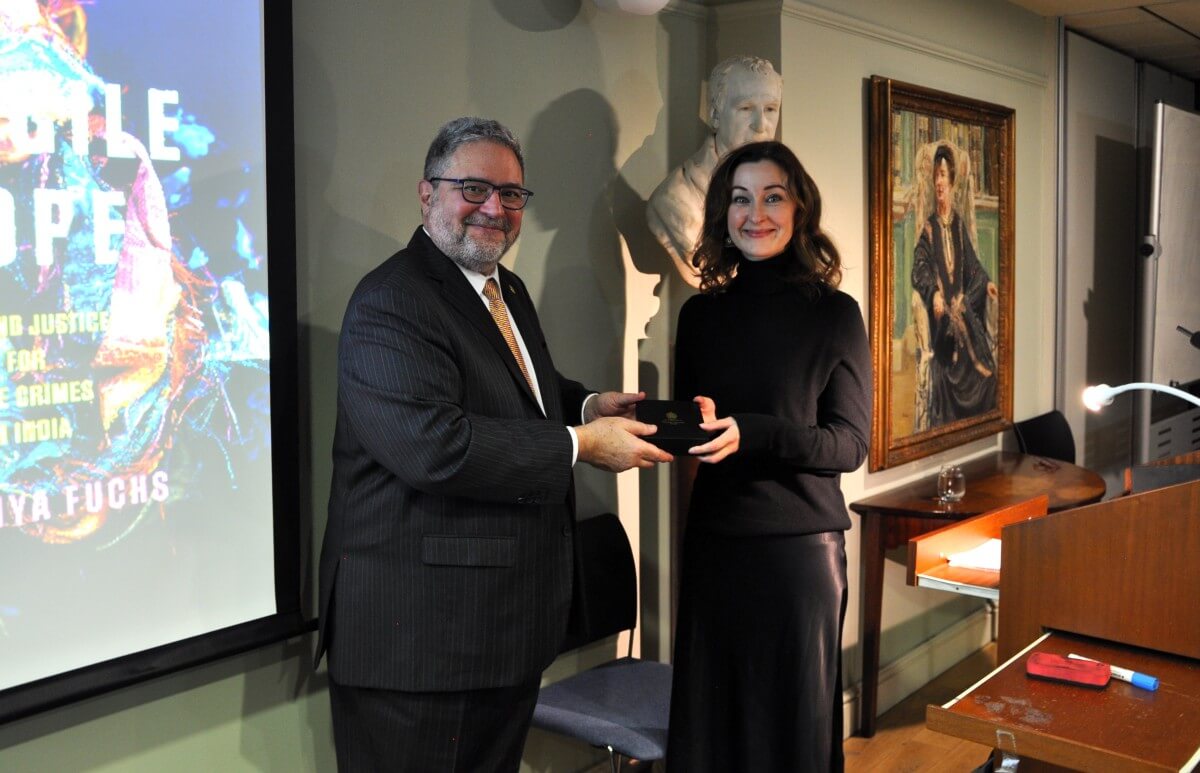 The Society’s President, Dr Norbert Peabody, began the event by reflecting on the origins of the prize. He expressed heartfelt gratitude to Dr Busuttil for his generosity, which has inspired the Society to engage more deeply with the discussions of human rights – an area not traditionally within its remit, yet profoundly relevant to contemporary society. Following this, Professor Alpa Shah, Statutory Professor of Social Anthropology at the University of Oxford and also PhD supervisor to Dr Fuchs, introduced Dr Fuchs’s research and highlighted its significance.