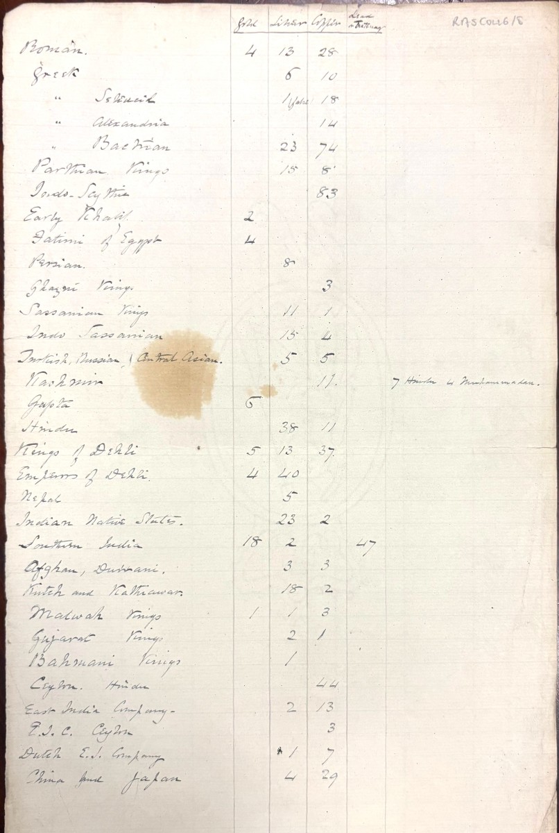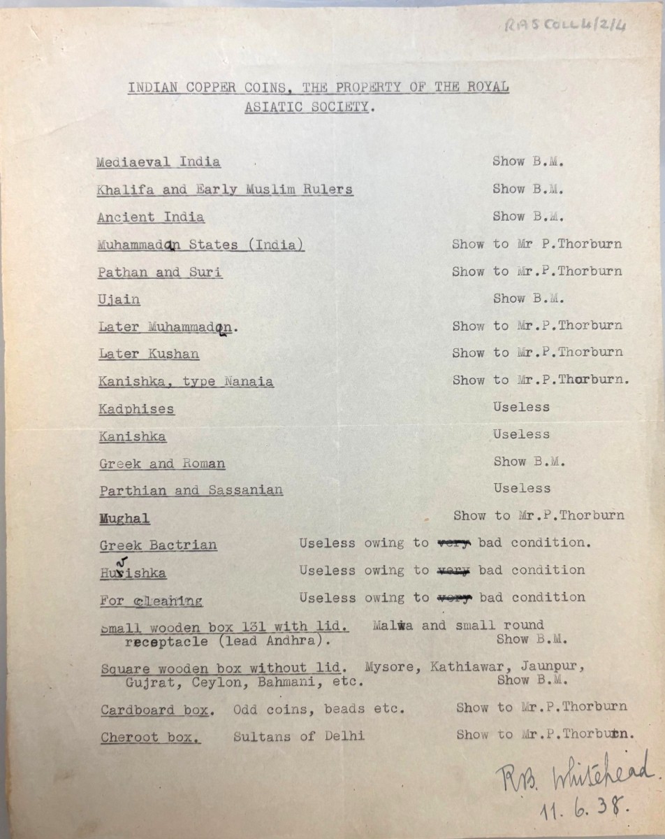 It would appear that the current coin collection is the remainder from the 1927 and 1939 sales, as coins from the Kushan Empire and Sultan of Delhi are mentioned in the correspondence for the second sale. Although the coin collection was not historically regarded by the Council as a major asset of the Society, the responsibility for its care has now fallen on us, and we will work to ensure that the collection is preserved and made accessible for research.