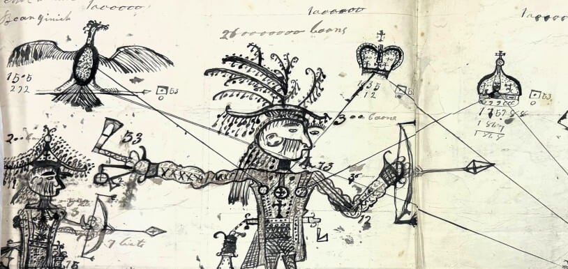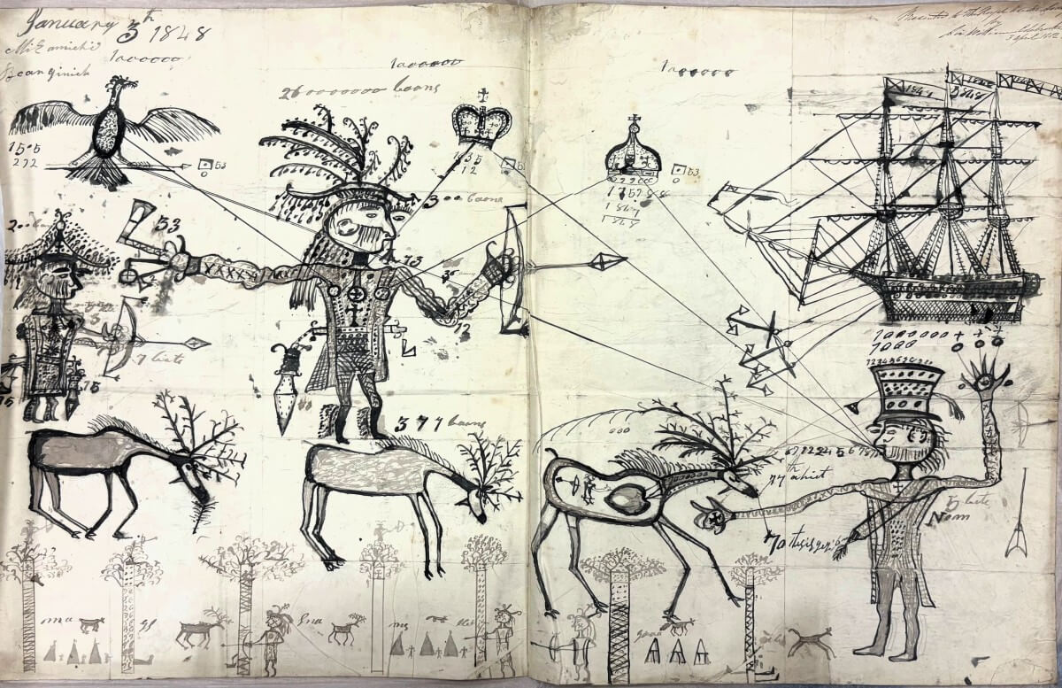 The new artwork catalogues recently made available on Koha include works that have long been in our backlog. A particularly intriguing (and also perplexing) one is a pen and ink drawing (108) donated by Sir William Colebrooke (1787–1870). It depicts three figures in indigenous costume, two holding a bow and an arrow; three reindeer; a bird, possibly a thunderbird, the mythological bird-like spirit in North American indigenous culture; two crowns and a sailing vessel. The context in which the drawing was made is unclear. An entry dated 3 April 1852 in our Donations Register records this as ‘a North American Indian drawing, or picture writing’, without giving further information on its content. With a subject matter on North American culture, this drawing appears to fall outside the scope of the Society’s areas of interest, but it was done in such a stylised way which makes it an interesting work to study. Sir William Colebrooke was the Governor of Colony of New Brunswick from 1841 to 1848, so this drawing might have come into his possession through his official role in North America. If anyone could shed some light on the symbolism of the drawing, we would be most grateful!
