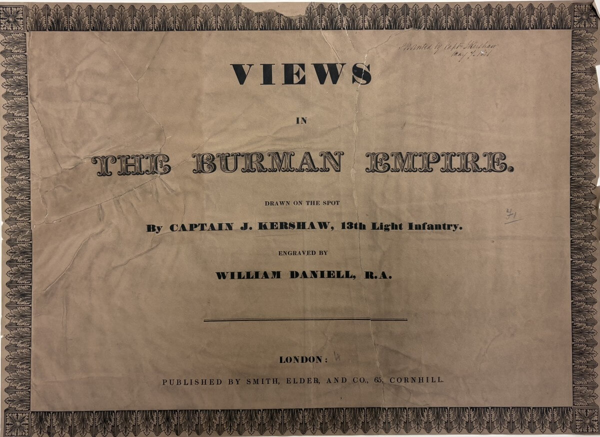 The first is a large‑format album entitled Views in the Burman Empire, published in London in 1831. It contains ten coloured engravings based on paintings of Burma by Captain James Kershaw. The catalogue for the album can be found here.