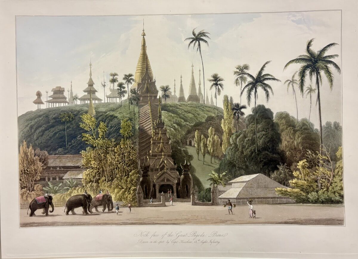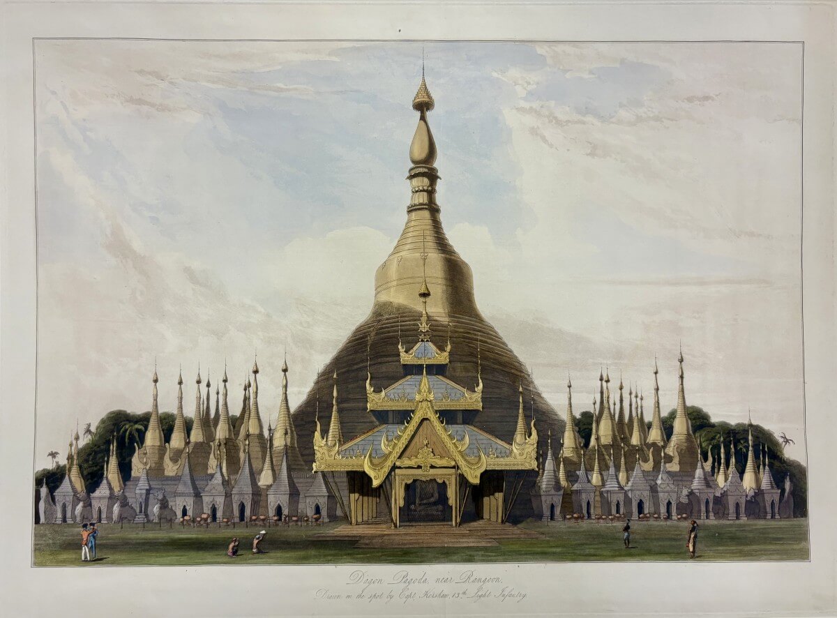The engravings themselves are of exceptional quality, hand‑aquatinted by the artist William Daniell, who – together with his uncle Thomas Daniell – was celebrated for picturesque views of India and jointly designed the Society’s iconic elephant emblem. Kershaw’s selection of subject is entirely topographical and architectural, often featuring the grand structures. Half of the album’s plates depict pagodas or views from pagodas, particularly in Rangoon (Yangon) and Prome (Pyay). Thanks to Daniell’s mastery of tonal aquatint, the images are not only technically accomplished but also deeply atmospheric. They present a highly picturesque – some might even argue romanticised – vision of the Burman Empire, especially poignant given the turbulent aftermath of war.