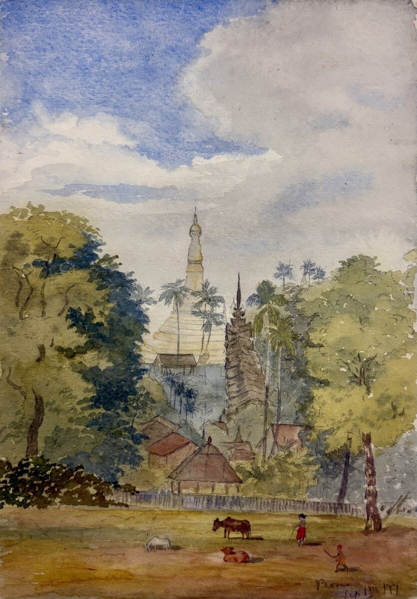 The artworks themselves reveal much about the couple’s interests. Their gaze was drawn less to monumental architecture but more to the rural life: landscapes, villages, animals, peasants, mountain huts and quiet paths winding into the woods. The Prome Pagoda appears here too, though in a markedly different way than in Kershaw’s depictions. Instead of dominating the scene, it sits gently in the background of an open field where two children graze animals – a pastoral counterpoint to Kershaw’s grand, architectural focus.