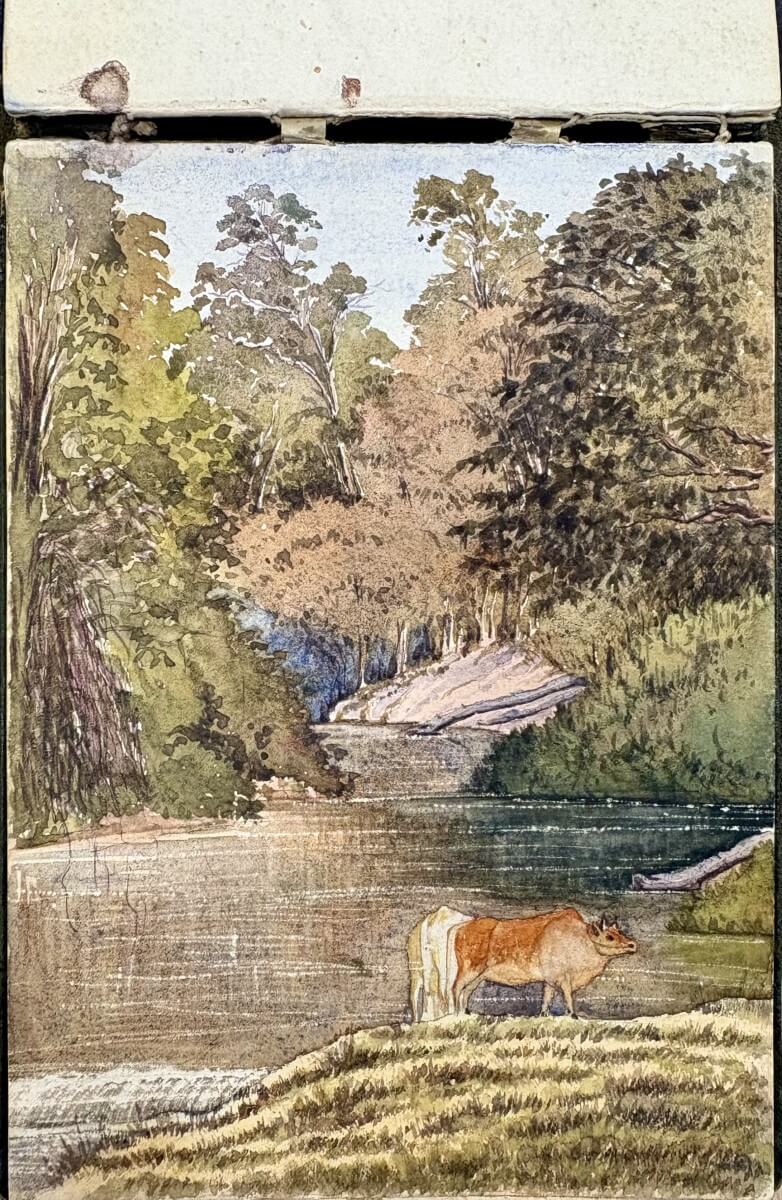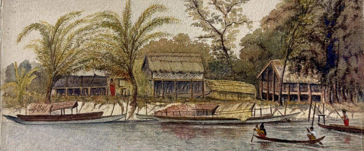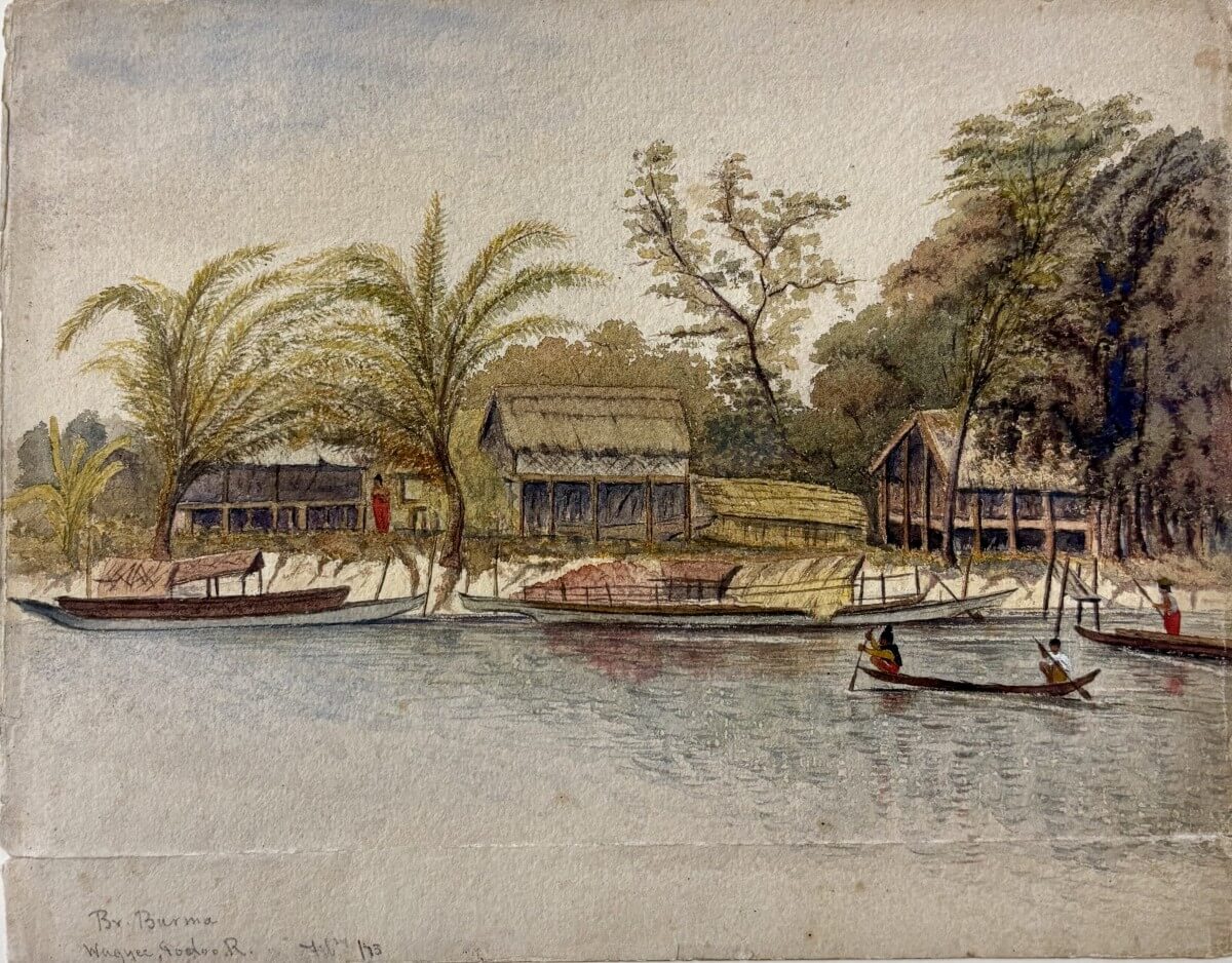 Also found within this collection is a small sketchbook, dating from 1875 to 1876, filled with Arthur’s drawings and watercolours of Rangoon, Shwegyin and surrounding districts in Burma. These works radiate a painterly tranquillity, echoing the picturesque qualities of Kershaw and Daniell yet with a softer, more intimate touch. Some drawings bear pencil inscriptions at the back identifying the location at which it was painted and the date, such as this one, at [Tandagyee] Jungle, Shwegyin District, 5 February 1876: