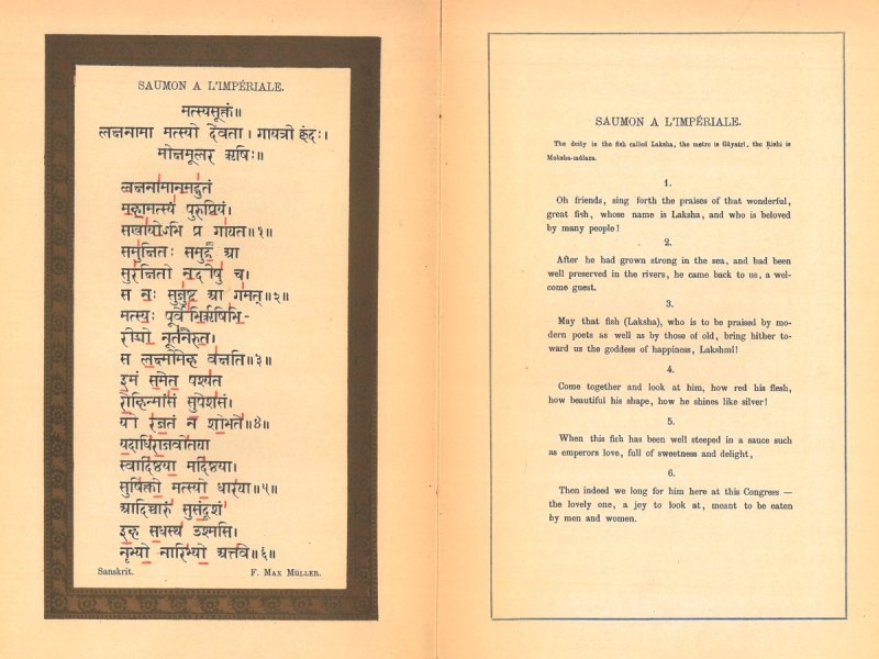 The languages featured span both ancient and modern, including Hieroglyphs, Cuneiform, Hebrew, Manchu, Malay, Javanese and many others. One dish, called ‘Imperial Salmon’, is celebrated with a Sanskrit poem signed by F. Max Müller, German-British philologist who studied Sanskrit among other languages. The poem contains references to Lakshmi, the goddess of wealth and prosperity in Hinduism, and its English translation is as follows: