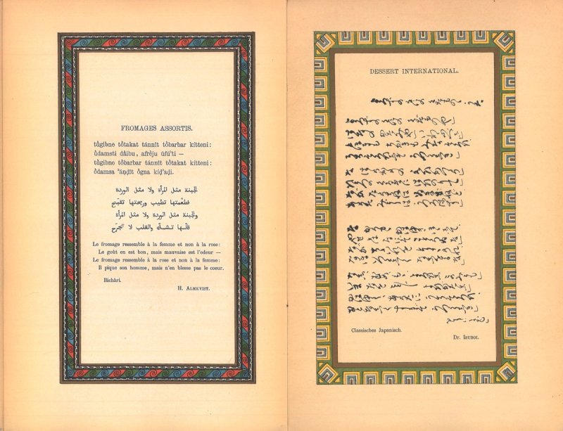 The item that caught my attention – which also prompted this blog post – is a dinner menu booklet from the 1889 Congress. Its cover design pays homage to one of the world’s oldest civilisations, featuring a pyramid and what appears to be an Egyptian sphinx, framed by decorative borders and crowned with the coat of arms of the Kingdom of Sweden and Norway. Inside, an insert lists the courses served at the dinner, and the main body – nearly 50 pages long – is a fascinating interplay of language and culinary culture. Each dish is celebrated by a poem or passage written in an Asian language, followed by a translation in either French, German or English – the designated lingua francas of the Congress.