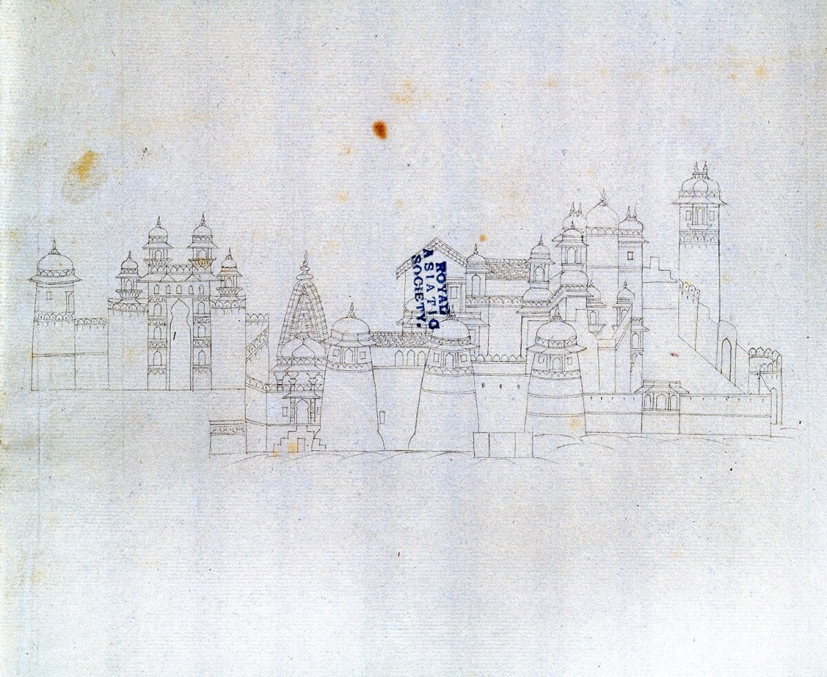 When not commanding Tod’s military escort, Waugh was a keen amateur watercolourist who often sketched alongside Ghasi. The Society’s collections are especially rich in the works of these two artists, and it is clear that Waugh greatly valued his association with Ghasi. Waugh’s appreciation is attested by the fact that he frequently inserted vignettes of the two working together in his renderings of the architectural sites they recorded.