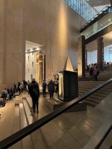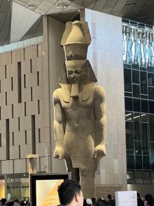 The opening of the Grand Egyptian Museum or GEM situated near the pyramids in Giza has been long awaited with much excitement. It was designed by Heneghan Peng architects of Ireland who apparently only had three members of staff when they won the competition. The project is estimated to have cost US$550 million and the foundation stone was laid in 2002. The Museum began limited public access in February 2023 and in October 2024 opened 12 main galleries including the Grand Hall and Staircase. It is planned that the Tutankhamun collection and solar boats will eventually be moved from the Egyptian Museum.