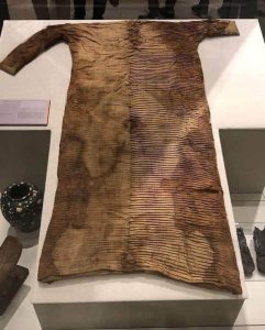 The ancient Egyptians made pleats in several ways. The weft threads were collected in small groups that were woven together on the edge of the cloth. Sometimes the clothes were washed in a resinous substance, and then the pleats were pressed firmly using a heavy tool. The pleats were often made by hand by washing the linen fabric and then squeezing it forcefully so that the warp threads gathered in groups to form the pleats, then this process was repeated after each washing. In the New Kingdom, weavers invented warping threads of varying thicknesses which makes the thin warp threads gather together after washing in wavy groups to form the pleats that decorate clothes. (This excellent description of pleating is taken from the label in the Museum.)