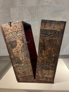 One item which particularly grabbed my imagination was this leather tent made of applique coloured leather in red, green and yellow and decorated with cut out leather ornaments and texts. It was made between 1046-1037 for the funerary purification of Isetemkheb II who was the daughter of the general and high priest Amun Masaherta. This was discovered in in 1881 in Deir el Bahri by Emile Brugsch and Ahmed Kemal and is the only Pharaonic leather tent that has survived. The coffin inside the baldachin on display is that of Isetemkheb’s cousin as her coffin was not found.