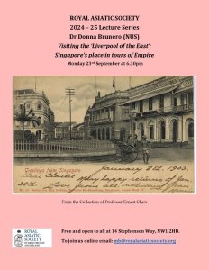 Nest week, the Society will host two lectures. On Monday 23 September, 6.30 pm, Dr Donna Brunero from the National University of Singapore will lecture on Visiting the ‘Liverpool of the East’: Singapore’s place in tours of Empire. Further details can be found on our website here.