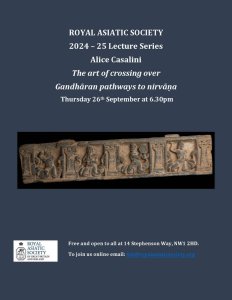 On Thursday 26 September, 6.30 pm, Alice Casalini, PhD candidate at the University of Chicago, will lecture on The art of crossing over: Gandhāran pathways to nirvāṇa. More details can be found here.