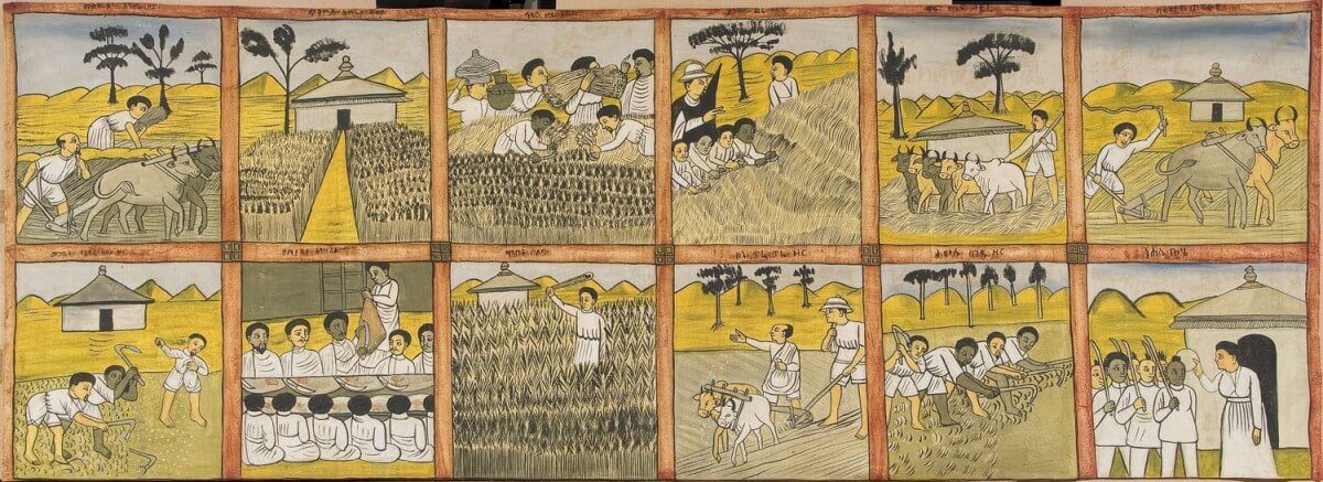 And there he might have remained all his life – embedded within the Ethiopian community. However, in 1976, after the death of Haile Selassie and the start of the Ethiopian Civil War, Pankhurst felt it necessary to leave the country. He returned to England, teaching at SOAS and LSE but, in 1978, he became the Librarian at the Royal Asiatic Society, a position he kept for several years before returning to Ethiopia in 1986. The papers I discovered belong to this time period of his life. Some of them are directly to do with his position as Librarian and therefore need to be retained within the institutional collection records. Others are to do with his own research and it is these that will become the ‘Papers of Richard Pankhurst’. During his time at the Society he continued his research into Ethiopia and even donated some Ethiopic material to the collections, the picture at the head of this blog post being one of them, representing the Ethiopian agricultural year.