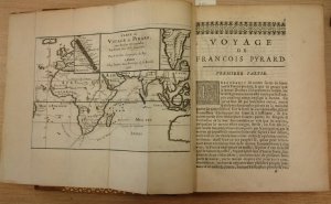 Other printed material include versions of the seventeenth century work, Voyage de François Pyrard, de Laval : contenant sa navigation aux Indes Orientales, Maldives, Moluques, & au Bresil & les divers accidens qui luy sont arrivez en ce voyage pendant son sejour de dix ans dans ces pais : avec une description exacte des moeures, loix, façons de faire, police & gouvernement : du trafic & commerce qui s’y fait; des animaux, arbres, fruits, & autres singularitez qui s’y recontrent : divise’ en trois parties. / avec des observations geographiques sur le present voyage, qui contiennent entr’autres, l’estat present des Indes, ce que les Europeens y possedent, les diverses routes dont ils se servent pour y arriver, & autres matieres / Par le sieur Du Val, Geographe ordinaire du Roy – that’s some title! Within the Collections is a 1669 French version and a nineteenth century English translation published by the Hakluyt Society.