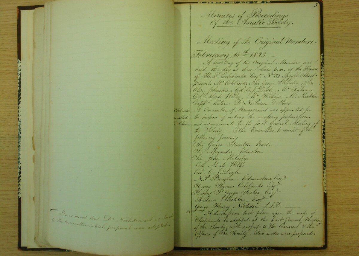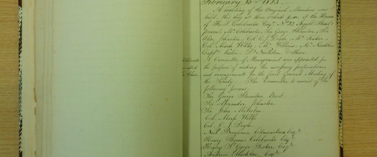 Before the Society’s inauguration a series of preliminary meetings were held, beginning on 9 January 1823 when fifteen men attended with Henry Thomas Colebrooke, the initiator, in the Chair. From this initial meeting it was resolved that a Society should be “instituted for the promotion of literature, science and the arts as connected with India and other countries lying to the eastward of the Cape of Good Hope”.