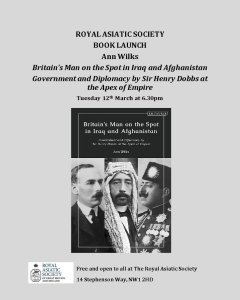 Tuesday 12th March, 6.30 pm, Ann Wilks (CBE) will discuss her new publication, Britain’s Man on the Spot in Iraq and Afghanistan, in which she examines newly discovered papers and colourfully-written letters of the Anglo-Irishman, Sir Henry Dobbs, and reveals his importance in the development of the modern Middle East.