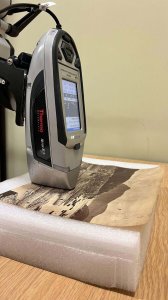 My research fellowship focuses on how photographs, commonly found in photographic albums or other forms of storage, are impacted materially by the ways they have been handled, stored and used within different types of collections. I am particularly interested in how material changes to the photographs can help us better understand the complex role that photography played in ideas about Britain’s rapid imperial expansion. This is where heritage science becomes a valuable addition to the art historical study of photographs and conservation strategies. Scientific analysis can not only identify how photographers and studios employed techniques and materials but it can also help build a picture of how photographs were used. Marc used an X-Ray Fluorescence Spectroscopy (XRF) machine which uses X-ray signals to help identify the elemental composition of a photograph.