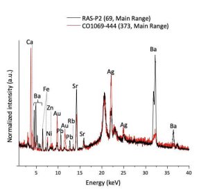 XRF analysis of the darkest areas on both prints showed that gold (Au) was used in the toning of both photographs, however gold (Au) and silver (Ag) were found to be present in much higher amounts in The National Archives photograph, which would explain why it is less yellow In the nineteenth century, gold toning was used to inhibit the problematic fading of albumen photographs; however it was a relatively expensive process. Another finding was the presence of barium (Ba) in The Royal Asiatic Society photograph which suggests the use of barium sulphate, or baryta, as a layer coating. Barium was not found in such pronounced amounts in The National Archives copy and this shows that different paper stock was used for the printing of each set of photographs, a finding that was not possible to ascertain from a visual analysis alone, since they were both mounted onto album paper.