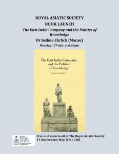 Our next event is on Monday 17th July when Joshua Ehrlich, from the University of Macau, will launch his new publication, the East India Company and the Politics of Knowledge. In the book, Ehrlich posits that a commitment to knowledge was integral to the Company’s ideology and how the Company cited this commitment in defence of its increasingly fraught union of commercial and political power. All are welcome at the Society’s premises for the lecture at 6.30 p.m., or you can join online. Please contact Matty Bradley on mb(at)royalasiaticsociety.org to obtain the online link.