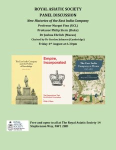The event following, will expand on this theme of histories of the East India Company. On Friday 4th August, 6.30 pm. we will hold a panel discussion, New Histories of the East India Company, when Joshua Ehrlich will join Professor Margot Finn (UCL) and Professor Philip Stern (Duke University) to discuss their various findings in their newly published books.