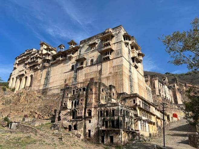 For me, Kipling’s description is far more compelling: “The Palace of Bundi, even in broad daylight, is such a palace as men build for themselves in uneasy dreams, the work of goblins, rather than of men. It is built into and out of the hillside, in gigantic terrace on terrace, and dominates the whole of the city…No-one knows where the hill begins and where the palace ends.”