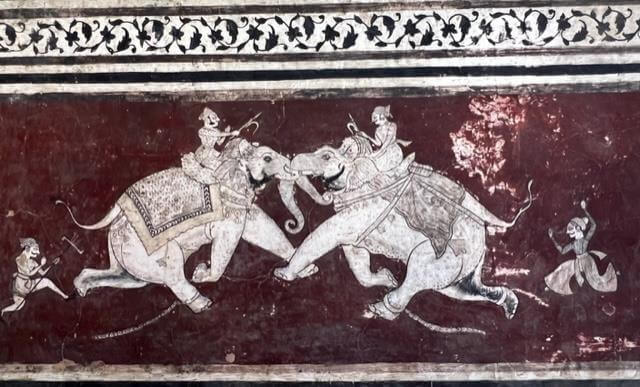 Susan and I were shown round the City Palace by the curator, accompanied by the heir to the throne, summoned back to Kotah on the accession of his father to the throne in order to learn the ropes. On our visit in February, apart from Norbert’s horse, we were shown some remarkable wall paintings, including one of a wrestling match – Zalim Singh’s favourite sport- and a lovely series in which the humans came off worse in a boar hunt.