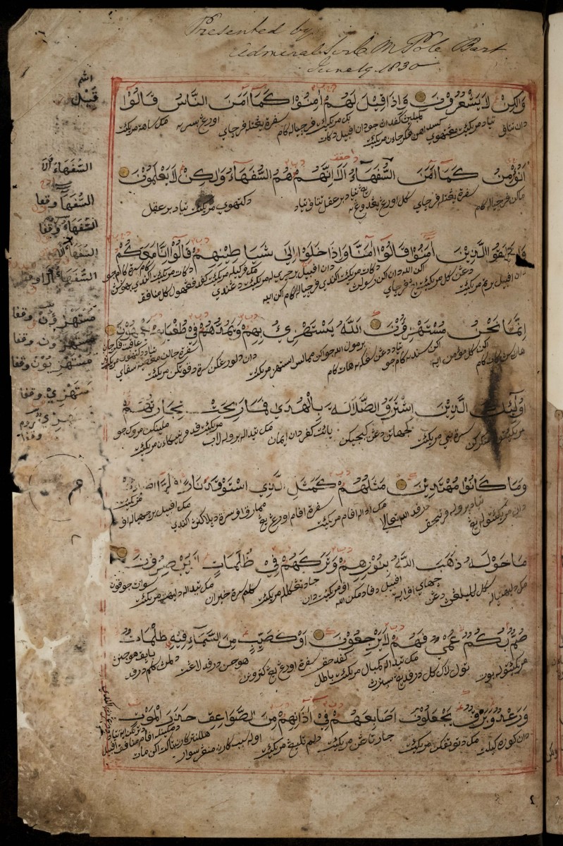 This manuscript was presented to the RAS by Sir Charles Morice Pole (1757-1830), a naval officer who had served in South Asia, shortly before his death. (For more information about this manuscript, see Annabel Teh Gallop, ‘Qur’an Manuscripts from Southeast Asia in British Collections’ (forthcoming)).
