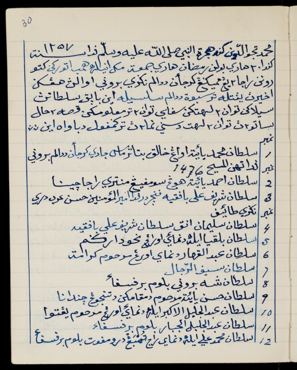 The second manuscript is Silsilah Raja-Raja Brunei, a history of Brunei [RAS Malay 123]. This manuscript is recorded as having been copied in AD 1936 by Haji ‘Abd al-Ghafur bin ‘Abd al-Mu’min of Sarawak. Part of the original text is much earlier, and this copy was based upon an earlier recension made in 1841. The manuscript is written in Malay in Jawi script, and a Romanised version was published as MS B in P.L. Amin Sweeney, ‘Silsilah Raja-raja Berunai’, Journal of the Malaysian Branch of the Royal Asiatic Society 1968 (41(2): 1-82). Now that the original text has been digitized, it can be viewed online via https://royalasiaticcollections.org/ras_malay_123/