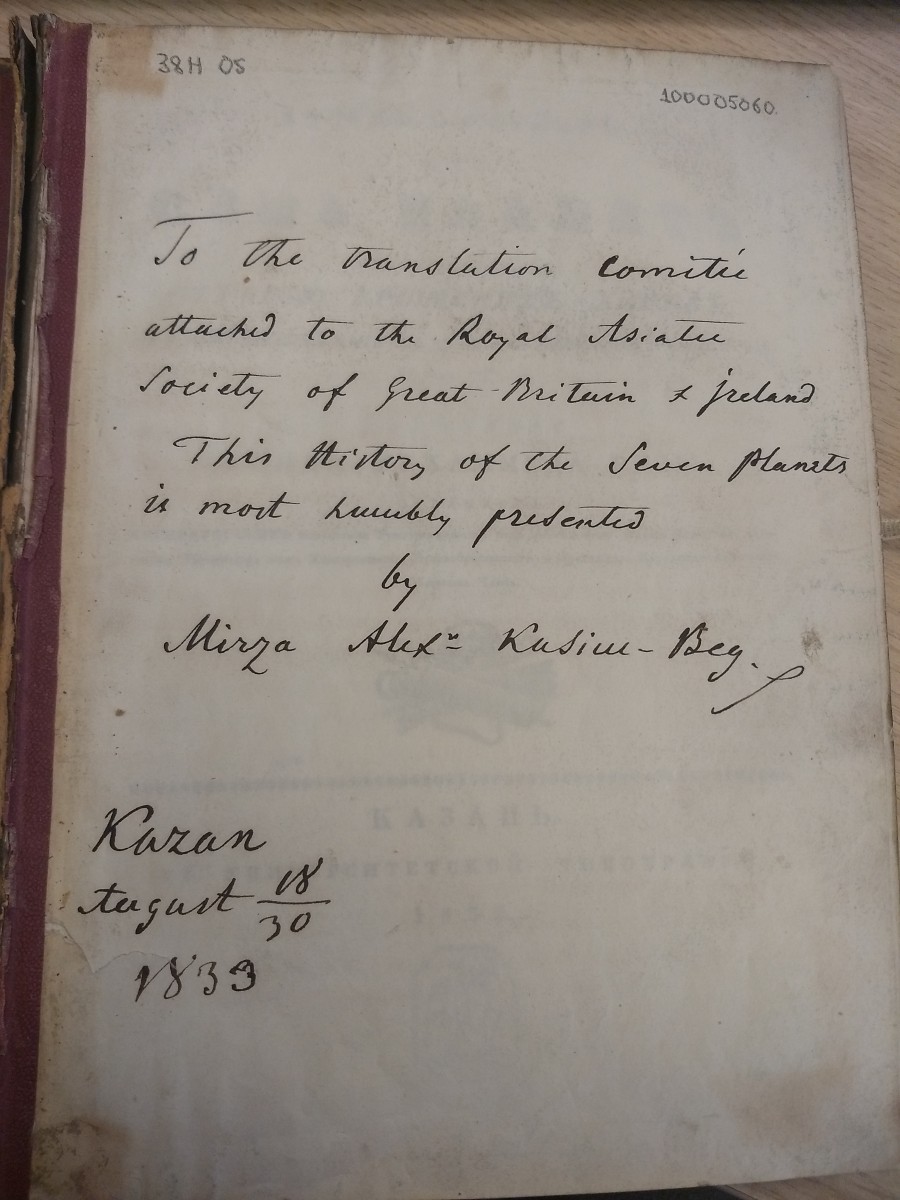 By 1830 he had become Associate Professor of Arabic and Persian and in 1846 succeeded Franz Erdmann as Professor. Erdmann, himself an early RAS member, may have encouraged Kazembek to join. RAS features prominently on the Seven Planets title page: “published…under the supervision of Mirza Kazembek, Associate Professor of the University, Member of the Royal Asiatic Society of Great Britain and Ireland.”