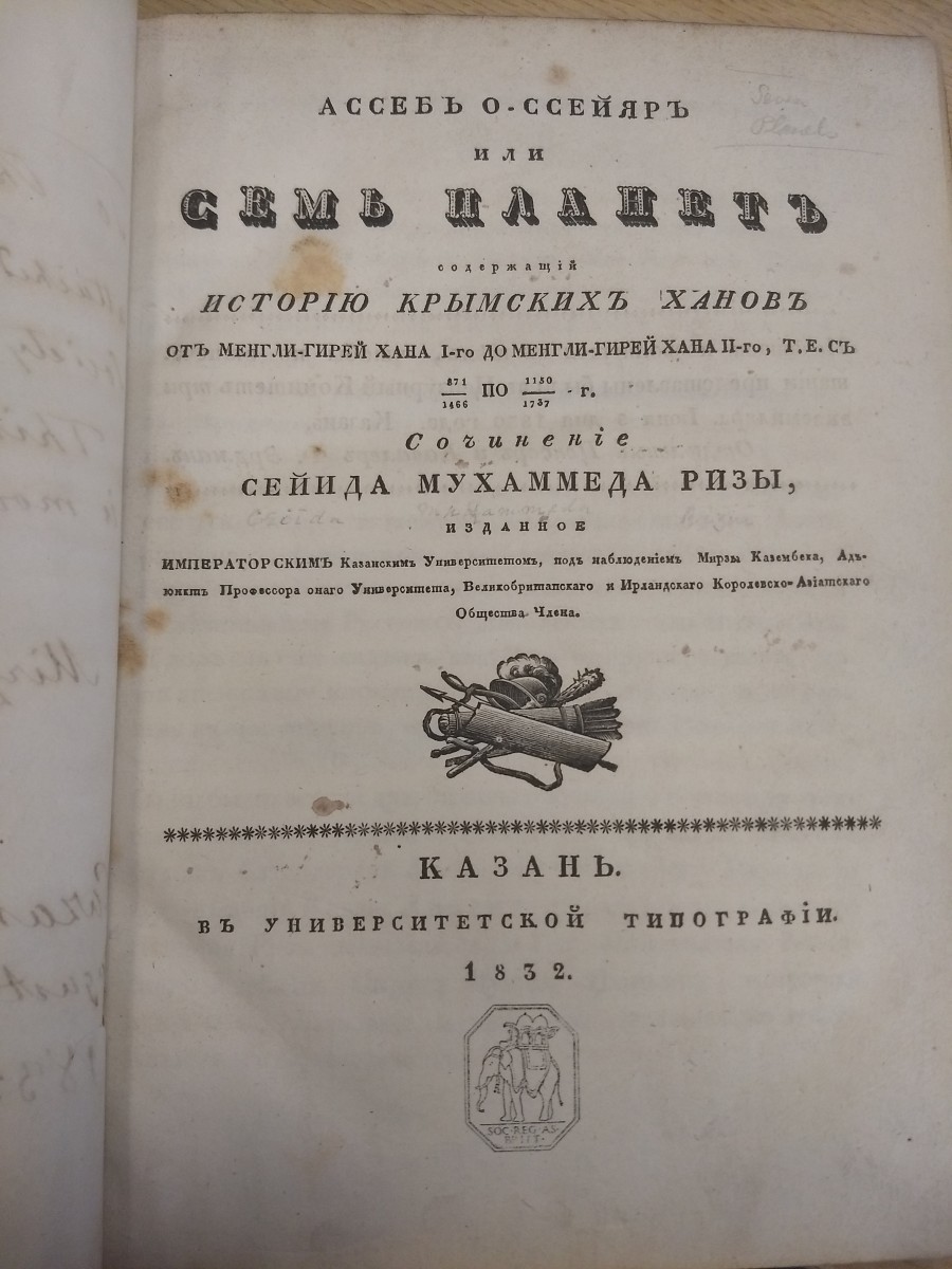 The Seven Planets (sab’a sayyara) by Sayyid Mohammed Riza is a history of the Crimean Khans in Ottoman Turkish, published by Kazan University in 1832. Riza completed this in 1737. In 1824 the university acquired a 1755 manuscript from the Kazan Mulla who had obtained it from a Bukharan returning via Kazan from pilgrimage to Mecca. The edition was prepared by Alexander Kazembek (1802-1870) who would go on to become the pivotal figure in Russian oriental studies, much like William Jones or Henry Colebrooke in British India. The text, collated since with other surviving manuscripts, republished and due to be fully translated, has become an established mine of information on Crimean history.