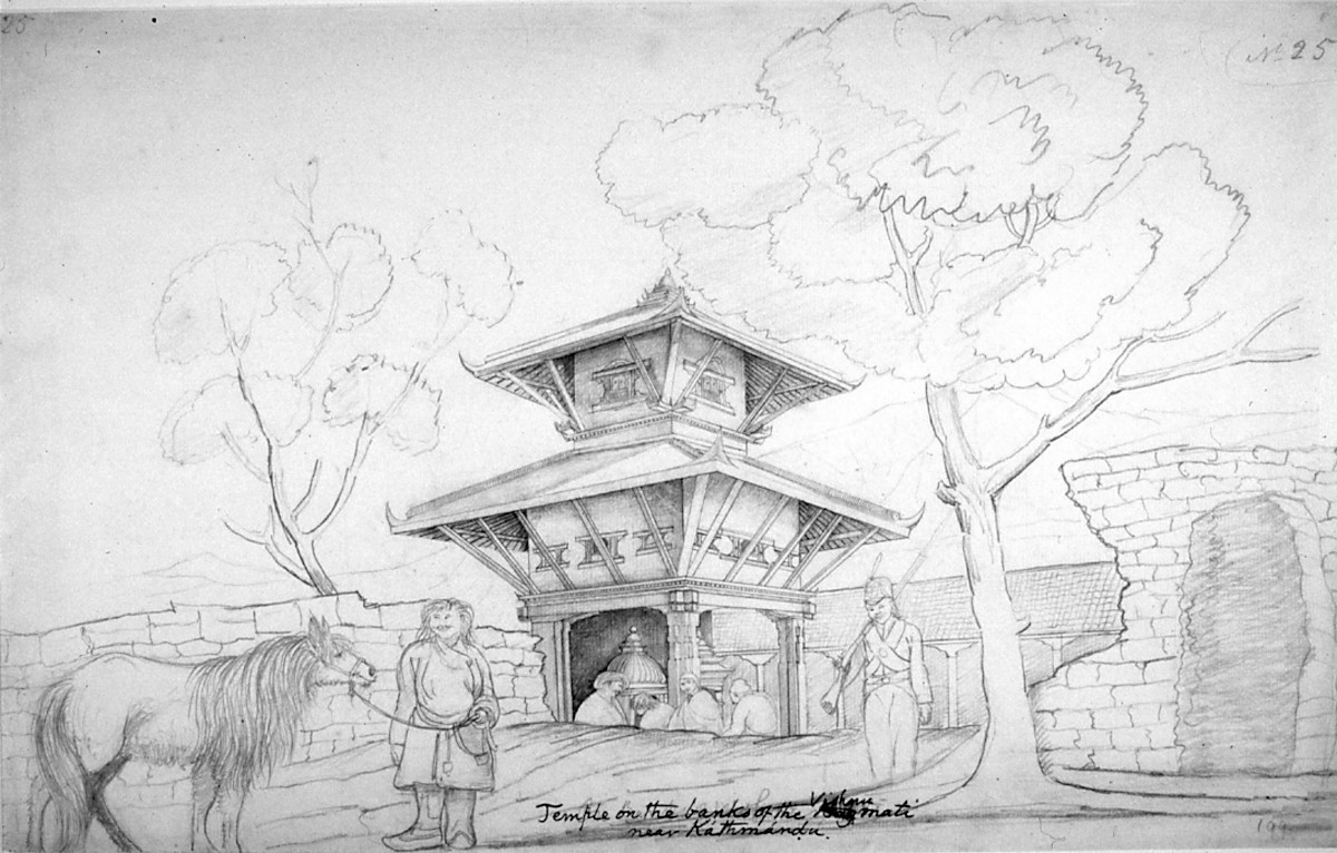 The Temple on the River Vishnumati, signed Raj Man Sigh, 1844, RAS. 022.025, 45.5 x 32.2cm