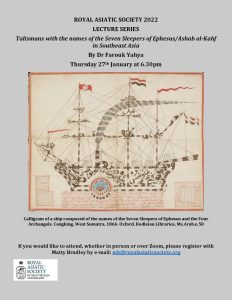 Our next lecture is on Thursday 27th January when Dr. Farouk Yahya, Research Assistant in the Department of History of Art and Archaeology, SOAS, will talk on “Talismans with the names of the Seven Sleepers of Ephesus/Ashab al-Kahf in Southeast Asia”