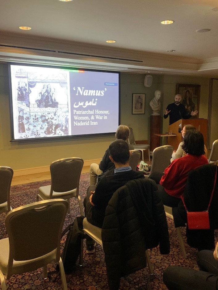 This Tuesday (23rd November), the Society welcomed Amir Parsa who gave a lecture on ‘Patriarchal Honour, Women, and War: The Concept of ‘Namus’ in Naderid Iran’s Military Narratives’. The event was well attended with Amir exploring the concept of nāmus which was documented in writings during the rule of Nāder Shah Afshar (1688-1747).