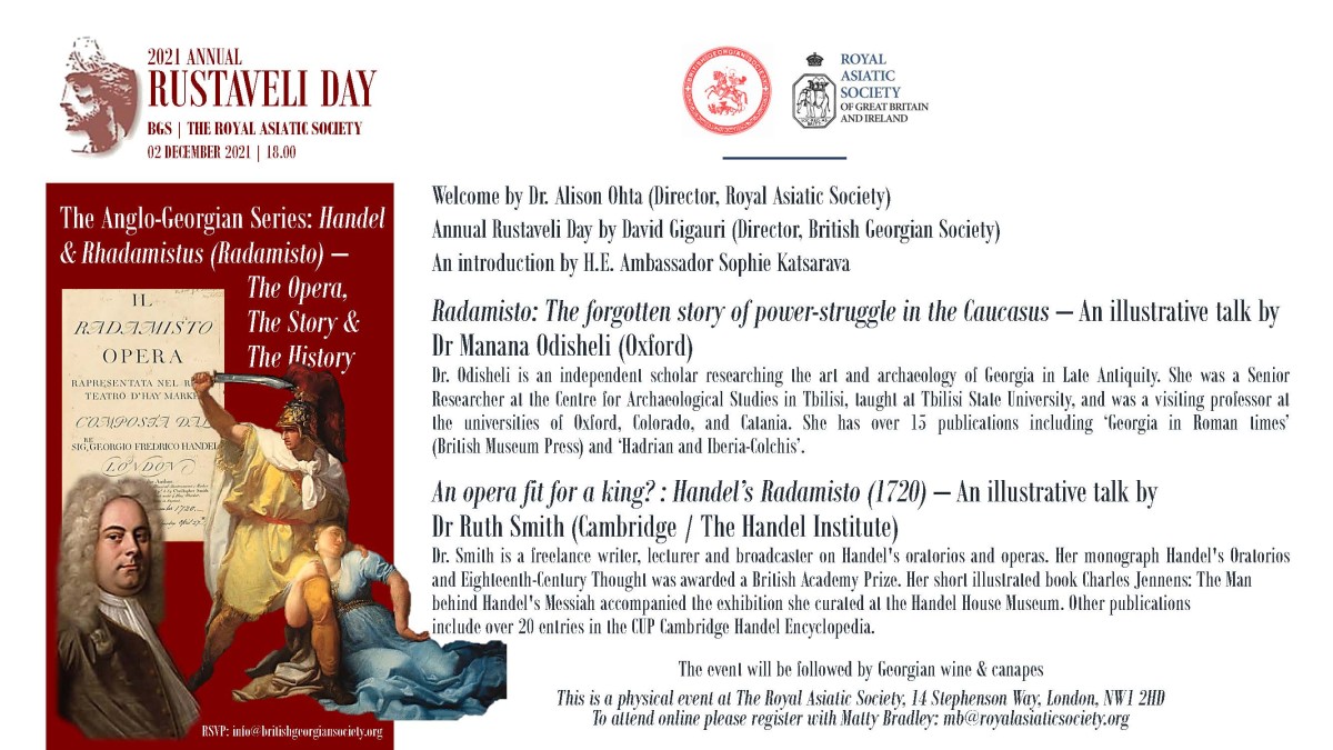 The annual Rustaveli Day celebrations will be taking place at the Society on Thursday 2nd December at 6pm with this year’s theme on ‘Handel & Rhadamistus (Radamisto) – The Opera, The Story & The History’. This will include talks from Dr Manana Odisheli (Oxford) on ‘Radamisto: The forgotten story of power-struggle in the Caucasus’ and Dr Ruth Smith (Cambridge/The Handel Institute) on ‘An opera fit for a king? Handel’s Radamisto (1720)’.