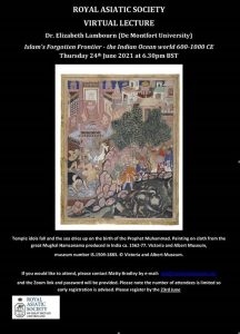 Please join us at 6:30 pm on Thursday 24th June for a virtual lecture by Dr. Elizabeth Lambourn (De Montfort University) on ‘Islam’s Forgotten Frontier – the Indian Ocean world 600-1000 CE’.