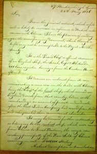 On display is a letter dated the 24th May 1836, from the British merchant, Thomas Weeding to Captain Harkness, Secretary of the RAS. He offers to donate ‘The Grand Chop’ ( the Chinese customs’ clearance document ) of The Sarah, the first independent commercial ship to dock in London from Canton after the East India Company had lost its trade monopoly.