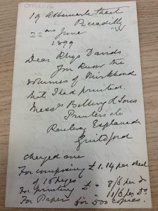 Rhys Davids played an active role in encouraging the British government to increase funding for the study of Indian languages and literature. During his time as Secretary and Librarian of the Royal Asiatic Society (1885-1904), he was involved in the work of the Oriental Translation Fund whose purpose was to publish translations of important works from across Asia. A number of letters are held within the Society’s archival collections between Rhys Davids and the Director of the fund, Forster Fitzgerald Arbuthnot which cover the fund’s general management.