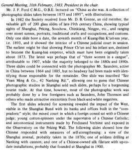 Dr. Amy Matthewson (Research Associate: SOAS) has kindly shared with us her experiences in working with the Society’s collection of Chinese glass lantern slides. Her engagement with this collection has formed the basis of an article that is included in the most recent edition of the journal and is titled: ‘The (Mis)Representation of Reality: ‘Knowledge’ and Image-Making in Glass Lantern Slides of China’.