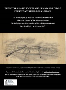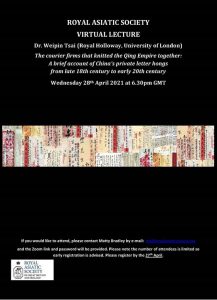 The first is the book launch on Monday 26th April of ‘The First Capital of the Ottoman Empire: The Religious, Architectural, and Social History of Bursa’ by Dr. Suna Çağaptay (University of Cambridge). We also have a virtual lecture on Wednesday 28th April by Dr Weipin Tsai (Royal Holloway, University of London) on ‘The courier firms that knitted the Qing Empire together. A brief account of China’s letter hongs from late 18th century to early 20th century.’ If you are interested in attending either of these events, please email mb@royalasiaticsociety.org to sign up.
