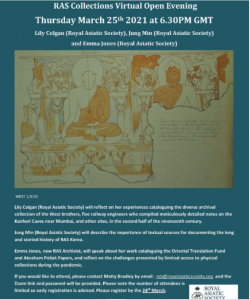 Lily Colgan (Royal Asiatic Society) will reflect on her experiences cataloguing the diverse archival collection of the West brothers, five railway engineers who compiled detailed notes on the Kanheri Caves near Mumbai, and other sites, in the second half of the nineteenth century.
