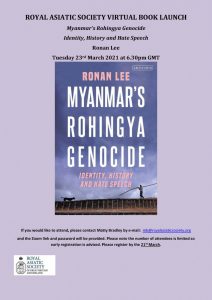 On Tuesday 23rd March at 6:30 pm, we have a virtual book launch by Dr. Ronan Lee on Myanmar’s Rohingya Genocide: Identity, History and Hate Speech. The publication draws on thousands of interviews and studies from the Rohingya in an attempt to assess and outline the full scale of the genocide in Myanmar.
