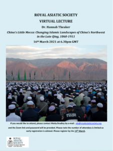 Please join us on Tuesday March 16 at 6:30pm for a Zoom lecture by Dr. Hannah Theaker entitled, China’s Little Mecca: Changing Islamic Landscapes of China’s Northwest in the Late Qing, 1860-1911. Dr. Hannah Theaker is a Visiting Fellow at the University of Oxford China Centre, whose research explores religion, ethnicity and migration in late imperial China.